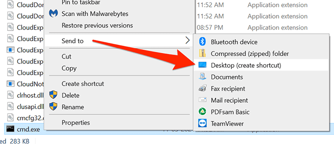 - Je zou nu een bestand moeten zien met de naam cmd.exe, het uitvoerbare bestand van de opdrachtprompt. Klik met de rechtermuisknop op het bestand cmd.exe en selecteer Verzenden naar > Bureaublad (snelkoppeling maken).