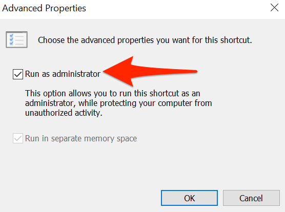 - Activeer in het geopende venster Geavanceerde eigenschappen het vak Als administrator uitvoeren en selecteer vervolgens OK onderaan.