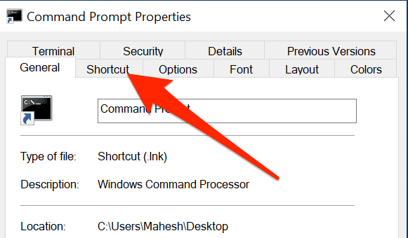 - Selecteer de Snelkoppeling tabblad bovenaan het venster Eigenschappen.