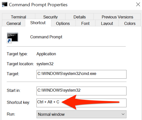 Je kunt het openen van de opdrachtprompt nog gemakkelijker maken door een sneltoets toewijzen aan de sneltoets op het bureaublad van de tool. In Windows kun je een aangepaste toetsencombinatie kiezen voor de snelkoppeling.