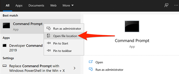 - Klik met de rechtermuisknop op Opdrachtprompt in de zoekresultaten en selecteer Bestandslocatie openen.
