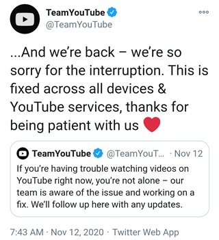 YouTube heeft de situatie erkend en het probleem voor iedereen opgelost gebruikers en hebben een follow-up commentaar gegeven met een verontschuldiging voor de onderbreking.