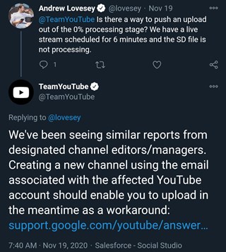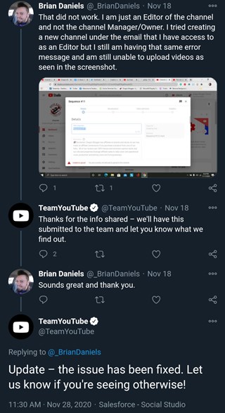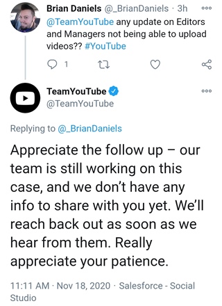 IST 13:45 uur: het lijkt erop dat toegewezen redacteuren en beheerders van YouTube-kanalen geen video’s kunnen uploaden naar het kanaal. In een nieuw antwoord op een vraag op Twitter beweerde TeamYouTube dat hun team nog steeds bezig is het probleem op te lossen.