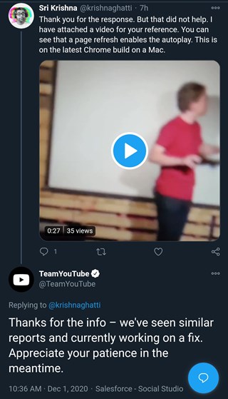 IST 05:35 pm: het lijkt erop dat veel gebruikers een probleem hebben waarbij de autoplay-functie blijft werken, zelfs nadat deze in browsers is uitgeschakeld. Gelukkig lijkt het erop dat YouTube op de hoogte is van het probleem en dat er aan een oplossing wordt gewerkt.