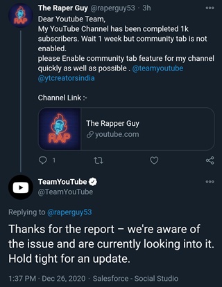 IST 15:17 pm: Sommige eigenaren van YouTube-kanalen beweren dat ze het tabblad Community niet kunnen gebruiken, zelfs niet nadat ze 1000 abonnees hebben gehaald en ze langer dan een week hebben onderhouden.