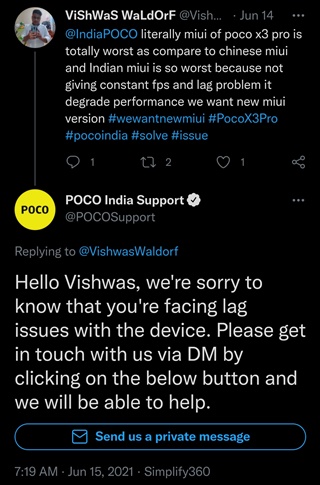 03:50 pm (IST): Poco-ondersteuning op Twitter vraagt gebruikers die vertraging ervaren op de Poco X3 Pro om hen een DM te sturen. Het is niet meteen duidelijk welke oplossing het ondersteuningsteam voorstelt.