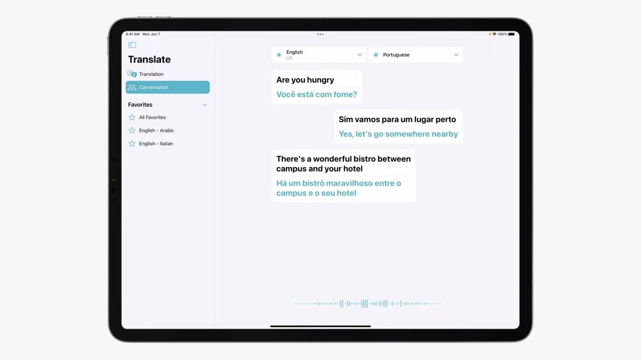 De gespreksmodus is bedoeld om te worden gebruikt door twee mensen die naast elkaar of tegenover elkaar zitten, en geeft weer wat elk persoon sprak met vertaling eronder. In combinatie met de nieuwe functie Automatisch vertalen, moet elke persoon vrijuit kunnen spreken, aangezien de iPad de taal herkent en wie er spreekt. Het vertaalde gesprek wordt automatisch in de juiste taal ingesproken.