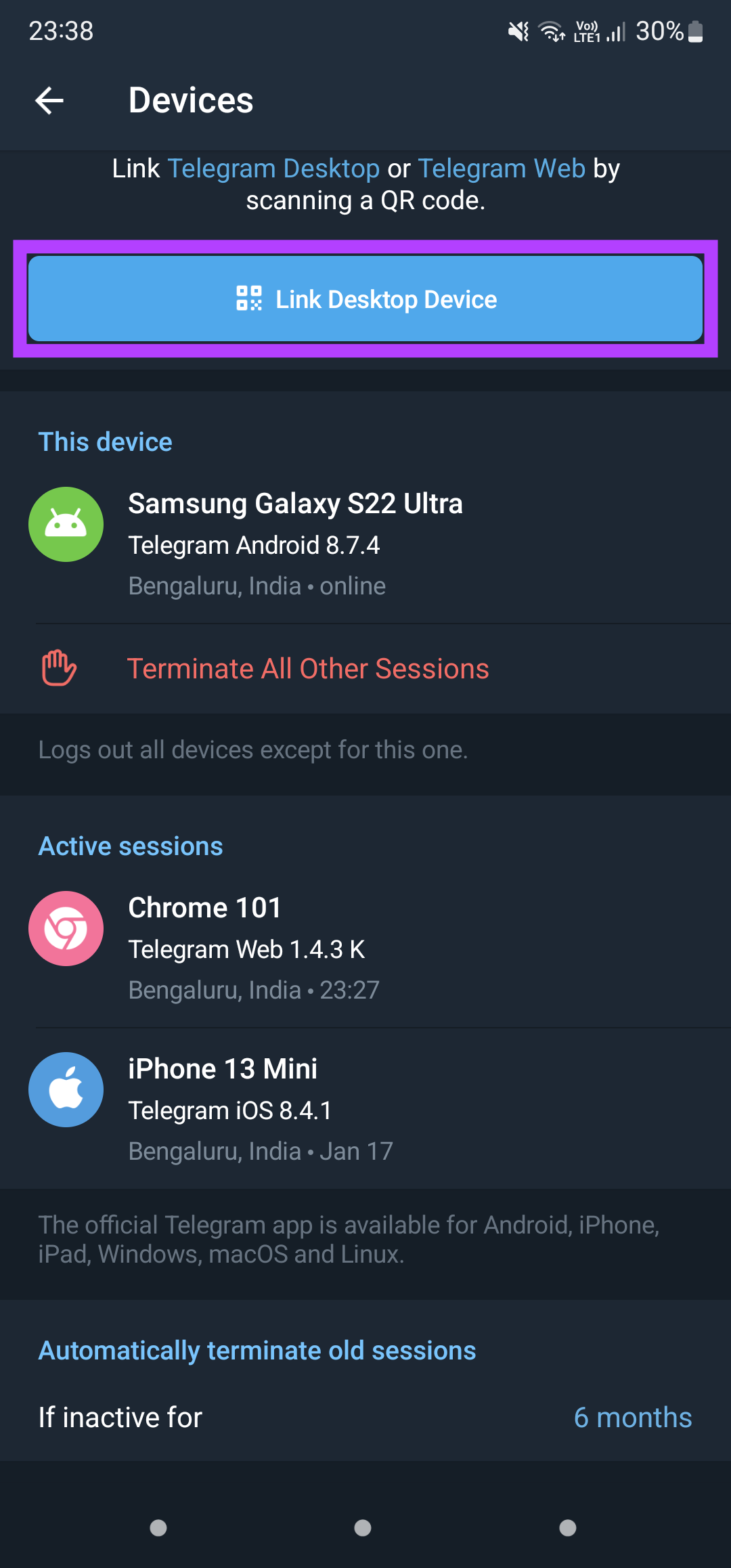 Er kan een probleem zijn met de werking van Telegram op uw computer. U kunt proberen uw computer uit de lijst met gekoppelde apparaten te verwijderen door de sessie van uw smartphone te beëindigen om dit op te lossen. Koppel het apparaat vervolgens opnieuw en kijk of het een verschil maakt. Zo doe je het.