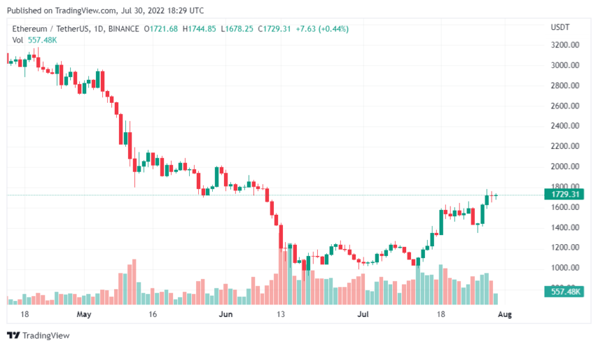 De aankondiging bracht ook een nieuwe prijsstijging voor ETH met zich mee, aangezien het op 28 juli met 15% steeg om te verkopen op $1.667 tijdens de ochtenduren van de Aziatische handelssessie. Deze positie toont een stijging van 47% over twee weken, ook al heeft het zijn hoogste prijspunt van 2021 nog niet bereikt.