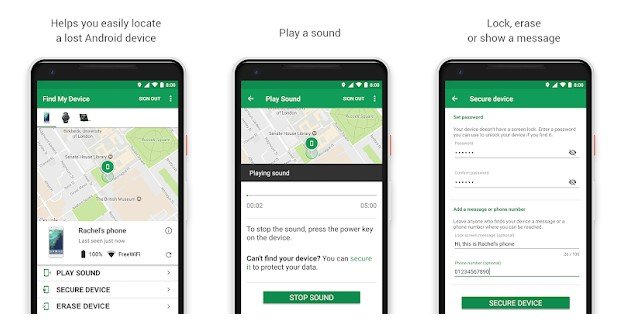 Dit is een native app voor het vinden van mijn telefoon die wordt aangeboden door Google. Als we het hebben over de functies, doet de app alle basisdingen, zoals alarmen, vergrendelingen, enz. Niet alleen dat, maar je kunt je telefoon ook wissen via de webinterface.