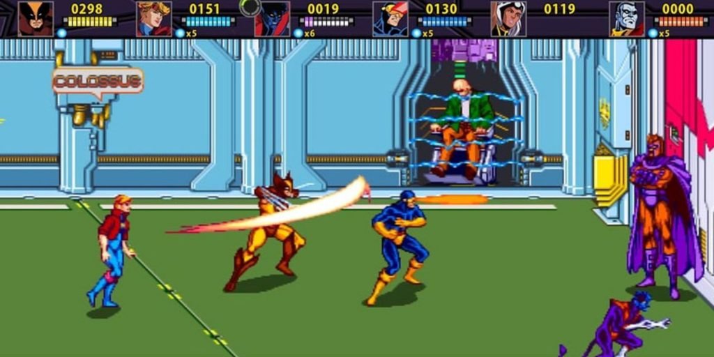 Gebaseerd op de tekenfilm’X-Men: Pryde of the X-Men’uit 1989, stelt Konami’s beroemde arcadespel spelers in staat om Wolverine, Cyclops, Colossus, Nightcrawler, Storm en Dazzler te besturen. Elk personage heeft een speciale aanvalsbeweging voor mutanten die ze tijdens gevechten kunnen gebruiken en die stoten, trappen en andere bewegingen kunnen gebruiken-Nightcrawler zal op en neer springen op neergehaalde vijanden. X-Men was een hoofdbestanddeel van arcades in de jaren negentig en het werd genomineerd voor meerdere AMOA-Amusement & Music Operators Association-prijzen, waaronder de meest gespeelde videogames. De populairste 6-persoonskast van de game maakte ook gebruik van dubbele monitoren.