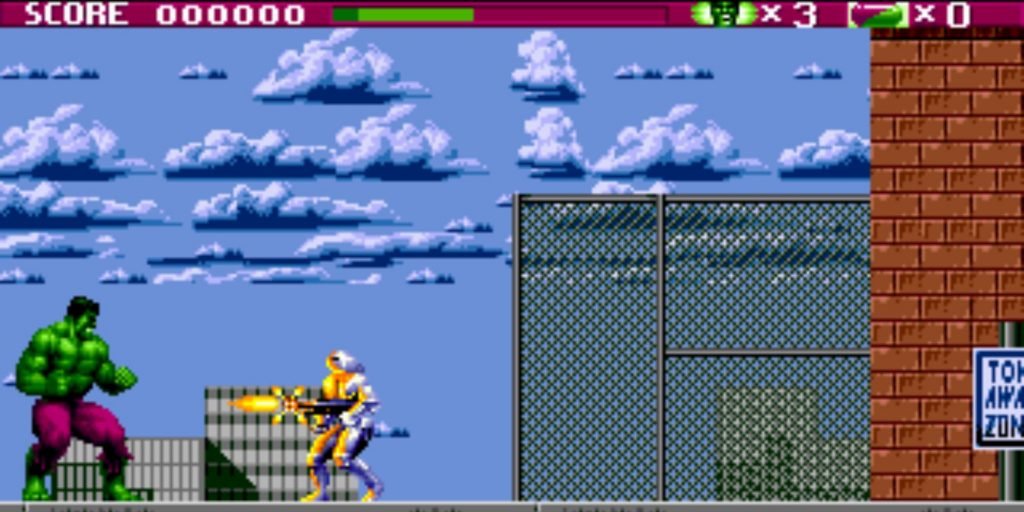 The Incredible Hulk, ontwikkeld door Probe Entertainment, was een-scrolling beat’em up waar je de leiding had over de grote groene man en moest voorkomen dat zijn aartsvijand de leider de wereld overnam. Afhankelijk van de hoeveelheid gezondheid die je had, had Hulk vier verschillende fasen’Hulk-Out’,’Super Hulk’,’Hulk’, en wanneer je gezondheid onder de 5% kwam, zou je in Hulk’s menselijke vorm en identiteit Bruce Banner worden-die was uitgerust met een pistool dat slechts twee kogels had. Maar in Banner veranderen was niet altijd een slechte zaak, want als je een gammacapsule nam, kon je in Banner veranderen en kleinere gebieden verkennen waar Hulk niet in kan komen zonder gamma te verliezen. De game bevatte vijf niveaus met verschillende eindbaasgevechten, waaronder Abomination, die tijdens het spel als minibaas fungeerde.