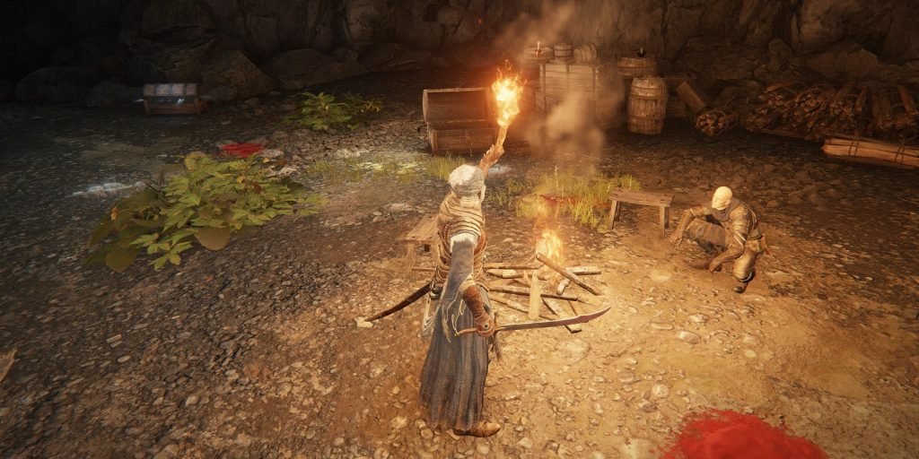 Zodra je de kist opent, Patches-al lang een bekend gezicht FromSoftware fans-zullen van bovenaf naar beneden springen. Zijn speeraanvallen doen behoorlijke schade, maar je zou weinig moeite moeten hebben om met hem om te gaan. Wanneer zijn gezondheid halverwege bereikt, geeft hij zich over. Stop met hem aan te vallen en hij zal smeken om je vergeving. Of je hem nu wilt vergeven of niet, hij zal je bij je volgende bezoek nog steeds aanbieden om je items te verkopen.Opmerking: als je per ongeluk Patches doodt, verzamel dan zijn Bell Lager. Je kunt zijn koopwaar later kopen in de Roundtable Hold. Keer terug naar Murkwater Cave’s site of Grace, rust uit en ga terug naar de baaskamer. Je vindt nu Patches in zijn iconische hurkzit, die zich warmt bij het vuur en aanbiedt om je zijn waren te laten zien.