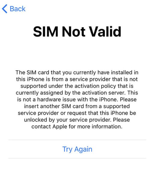 In het geval dat je iPhone is vergrendeld door je provider en je probeert een simkaart van een ander bedrijf te gebruiken, wordt er een SIM niet geldig