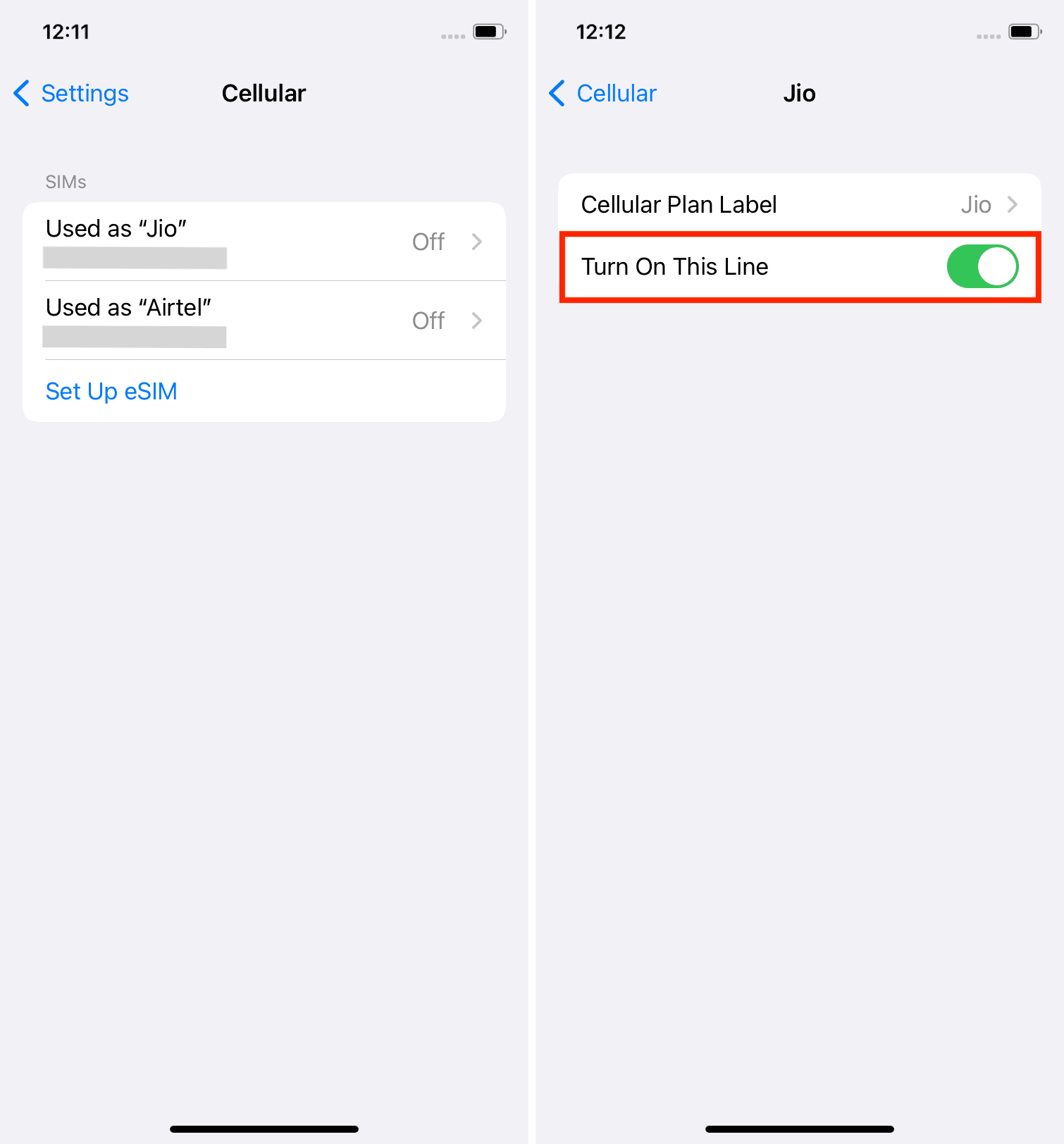 Als u twee SIM-kaarten gebruikt en er wordt Geen SIM weergegeven, ga dan naar iPhone Instellingen > Mobiel> tik op een simkaart en schakel de schakelaar in voor Zet deze lijn aan. Herhaal dit voor je andere simkaart.