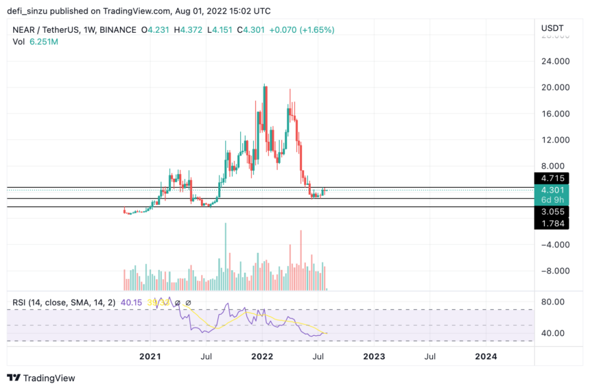 De weekgrafiek voor NEAR laat zien dat het voor grote weerstand van $ 4,73 na een omkering van het dieptepunt van $ 3,0