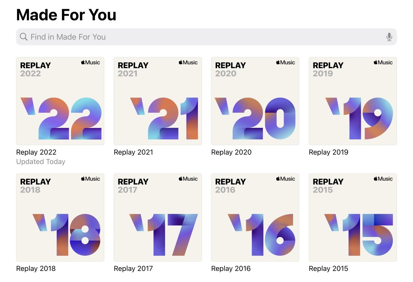 Hoewel de uitrol rustig was, bracht Apple hun versie van Spotify Wrapped uit, genaamd Apple Music Replay, waarmee gebruikers hun topnummers van het jaar konden zien, naar welke albums ze het meest luisterden en naar hun topartiesten.