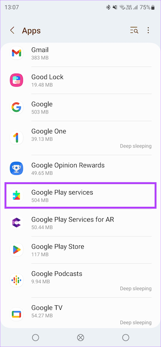 Stap 2: Scrol omlaag en selecteer de optie Google Play Services. Als u de lijst met apps hier niet ziet, selecteert u Alle apps en zoekt u Google Play-services.