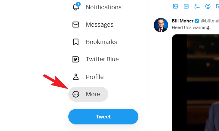 Om iemand op Twitter te deblokkeren klikt u vanaf de startpagina op’Meer’optie.