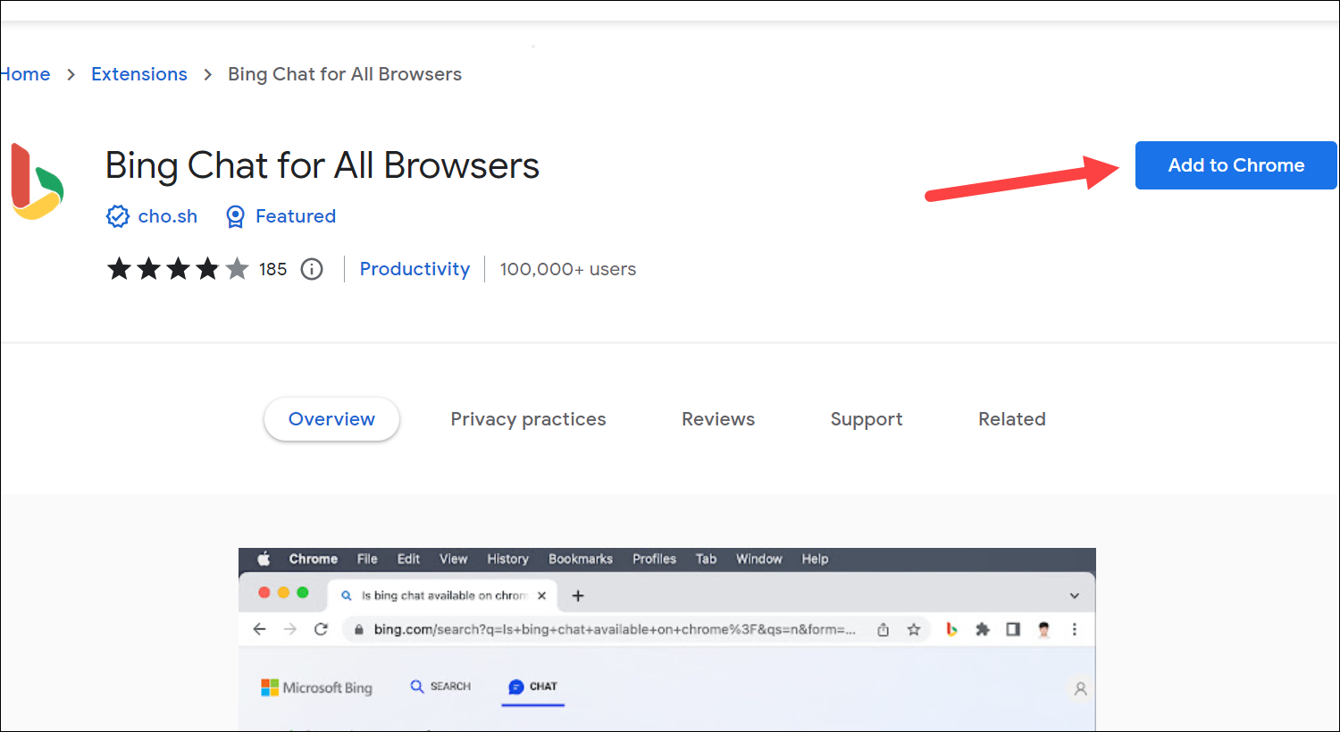 Om de Bing Chat voor alle browsers-extensie voor Chrome te installeren, gaat u naar de Chrome Web Store en zoekt u ernaar of klikt u hier. U komt op de vermeldingspagina van de extensie.