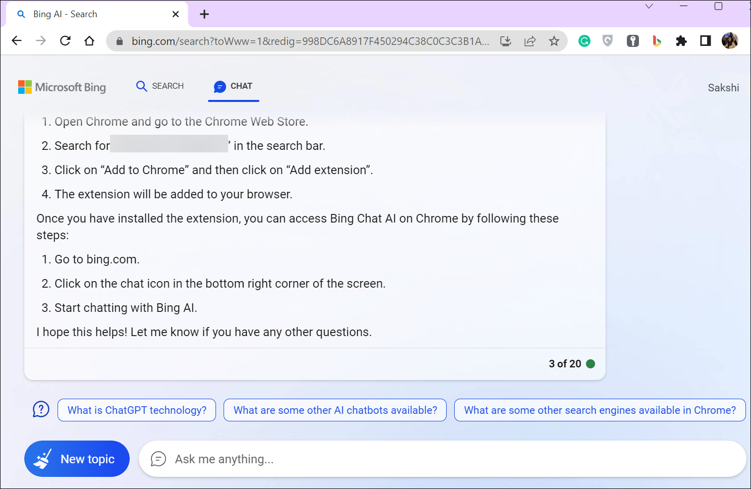 Welke browser u ook gebruikt, zodra u de extensie hebt geïnstalleerd, is het proces om Bing Chat AI te gebruiken hetzelfde. Het is vrij eenvoudig te gebruiken.