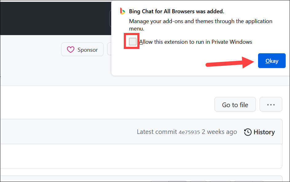 Een andere pop-up zal verschijnen om te bevestigen dat de extensie is geïnstalleerd. Als u de extensie ook in de modus voor privé browsen wilt uitvoeren, vinkt u de optie’Deze extensie mag in privévensters worden uitgevoerd’aan. Klik op’Oké’om de pop-up te sluiten.