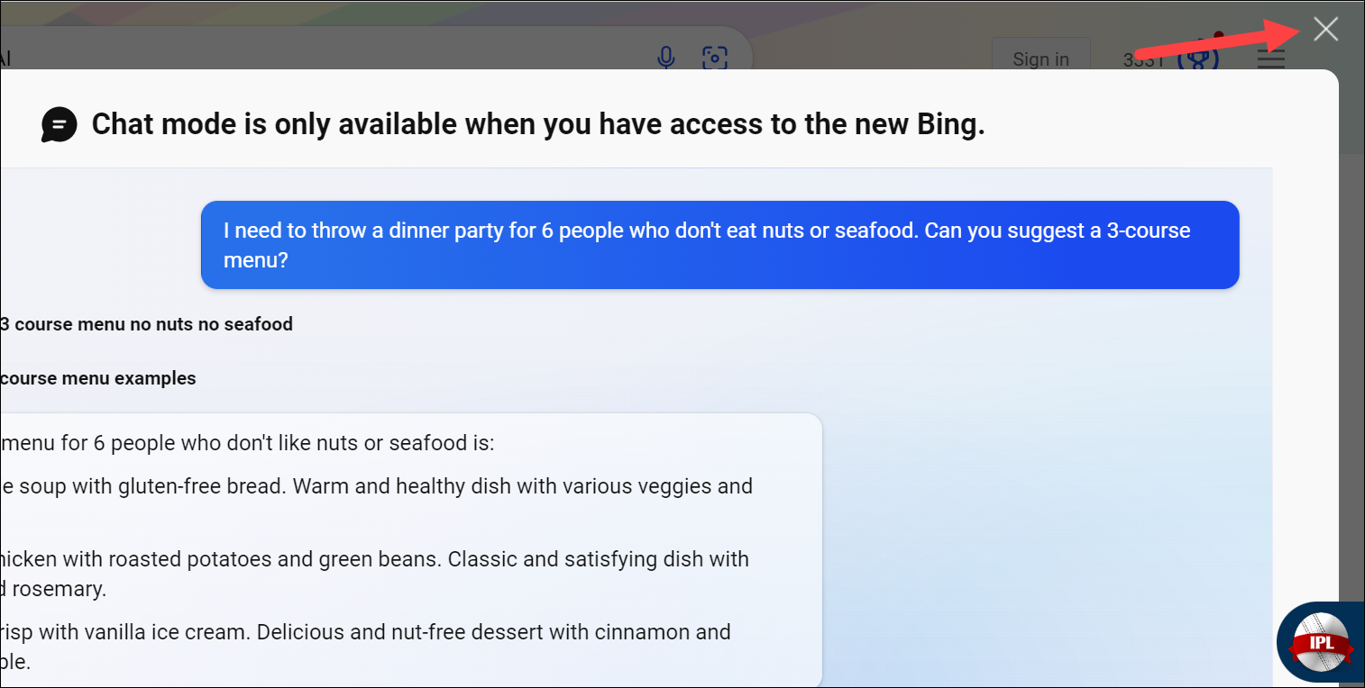 Als je nu Als u al bent aangemeld bij uw Microsoft-account dat toegang heeft tot Bing Chat AI, bent u klaar om te gaan. Anders krijg je een melding dat’Chatmodus alleen beschikbaar is als je toegang hebt tot de nieuwe Bing’. Klik op het pictogram’Sluiten (X)’in de rechterbovenhoek.
