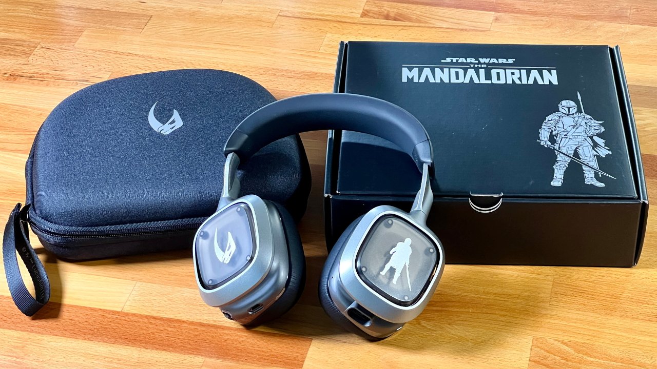 Wanneer u de externe doos verwijdert, vindt u een displaydoos met een Mandaloriaans thema met een afbeelding van Din Djarin en Grogu. Maar dat is nog niet alles: je krijgt ook een duurzame hardcase met het Clan Mudhorn-embleem, waarin je je headset en accessoires kunt opbergen.