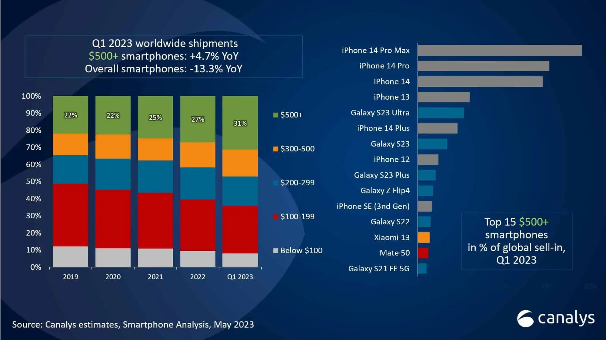 Volgens onderzoeksbureau Canalys was er in het premium of high-end smartphonesegment sprake van een ongebruikelijke groei in verzending in de eerste drie maanden van het jaar. Hoewel de totale markt jaar-op-jaar met meer dan 13% daalde, daalde de vraag naar de duurste telefoons nooit. In plaats daarvan ging dit segment tegen de wereldwijde trend in door een groei van 4,7% op jaarbasis. Bijna een op de drie smartphones die tussen januari en maart 2023 wereldwijd werden verkocht, had een prijs van $ 500 of meer.