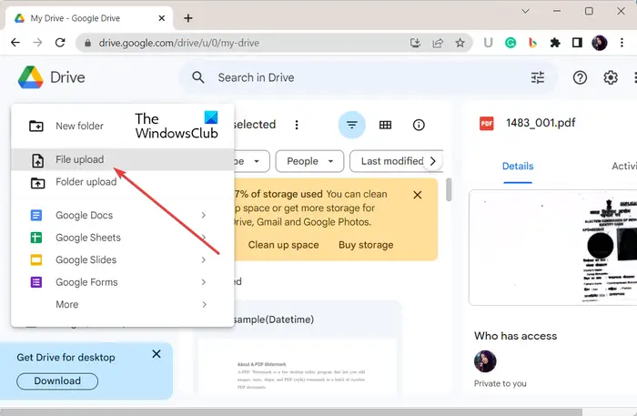 Klik nu op de knop Nieuw in het linkerzijpaneel en vervolgens druk op de optie Bestand uploaden. Blader en selecteer vervolgens de invoer-pdf met een watermerk.