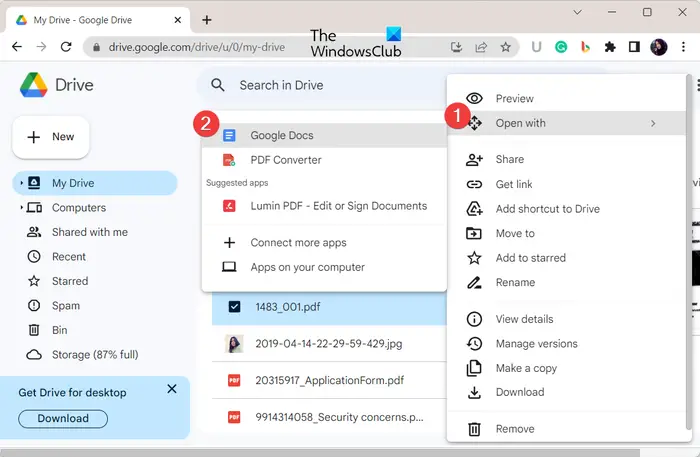 Zodra de pdf is geüpload, selecteert u de bijbehorende menuknop met drie stippen en klikt u op Openen met > Google Docs keuze. De pdf wordt nu in bewerkbare indeling geopend in Google Documenten.