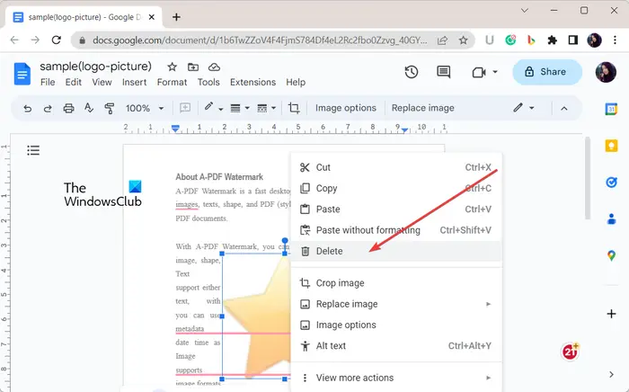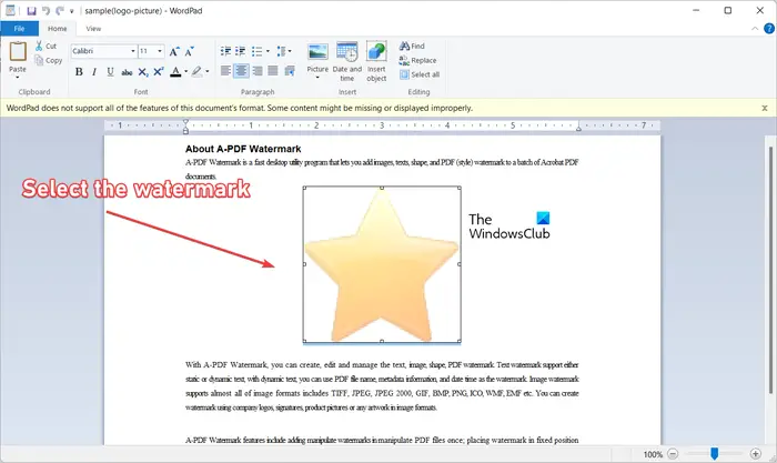 Selecteer nu het watermerk in het geopende document en druk op de knop Verwijderen om het te verwijderen.