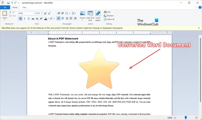 De volgende methode om een watermerk uit een PDF te verwijderen, is met WordPad Microsoft Word. Er is een truc die u kunt toepassen om het PDF-watermerk in Word te verwijderen. U moet eerst PDF naar Word converteren, het geconverteerde document openen in WordPad of Word, het watermerk verwijderen en het vervolgens opslaan in PDF-indeling. Laten we het proces in detail bespreken.