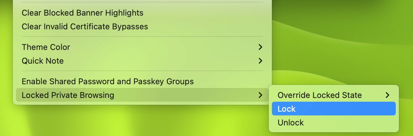 U kunt nu op Safari’s Debug-menu klikken en daarvoor Vergrendeld privénavigatie > Vergrendelen kiezen, of Vergrendelde privénavigatie> Ontgrendel om toegang te krijgen tot uw tabbladen voor privé browsen na authenticatie.