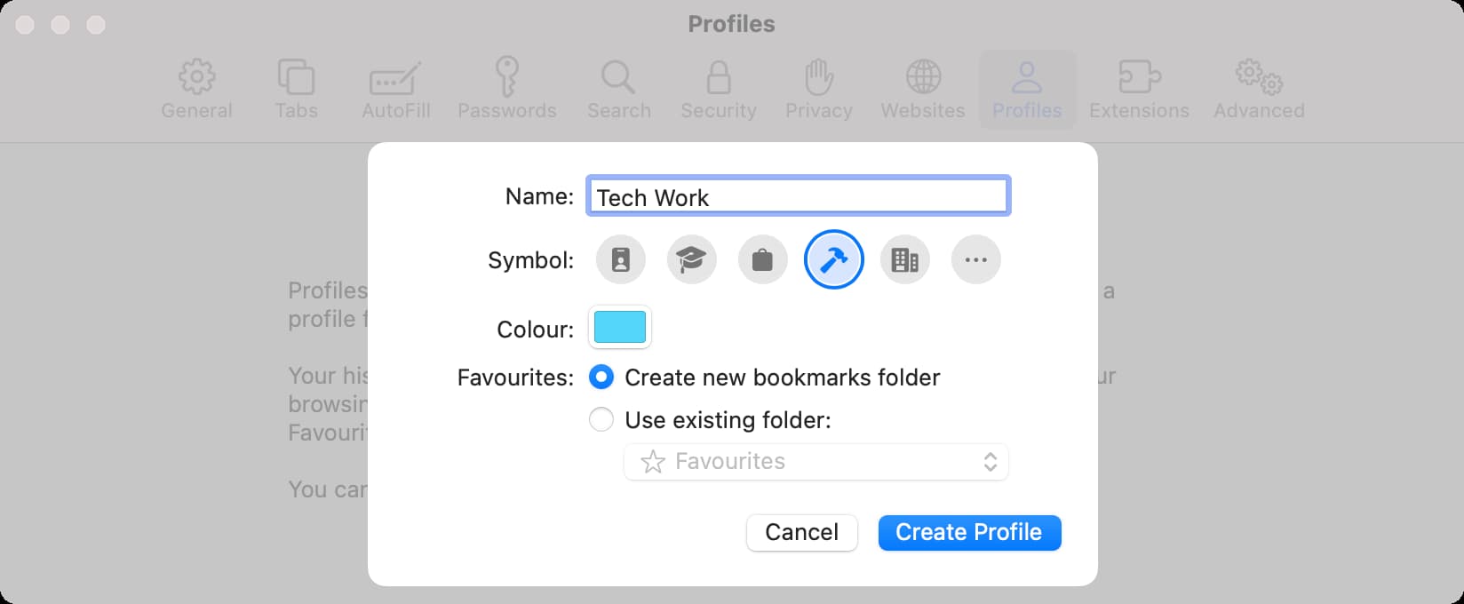 4) Geef dit profiel een naam. Kies daarna een symbool en kleur. Vervolgens kunt u een nieuwe map met bladwijzers maken om de zaken gescheiden te houden of een bestaande map gebruiken als bestemming voor websites die u als favoriet markeert.
