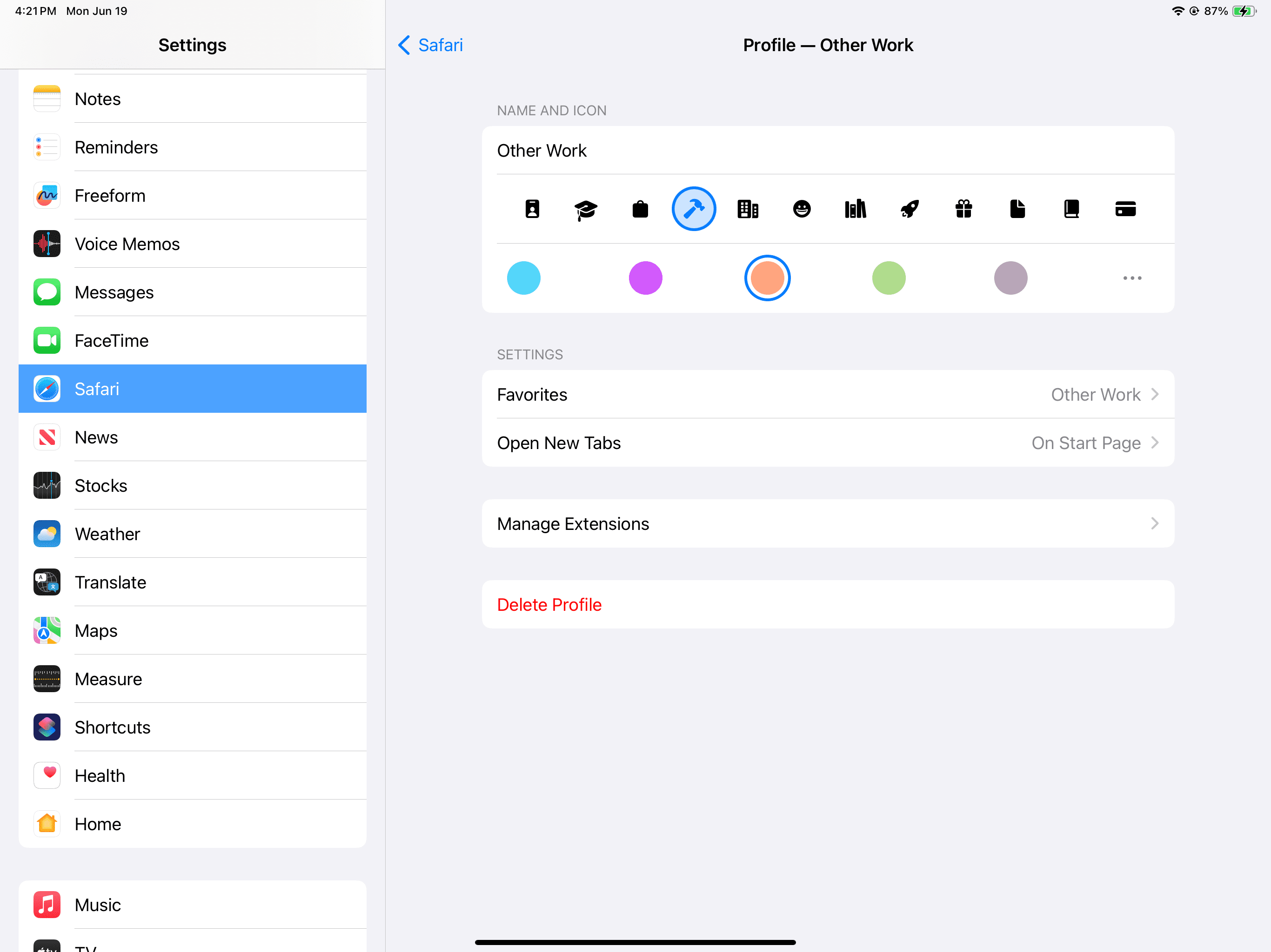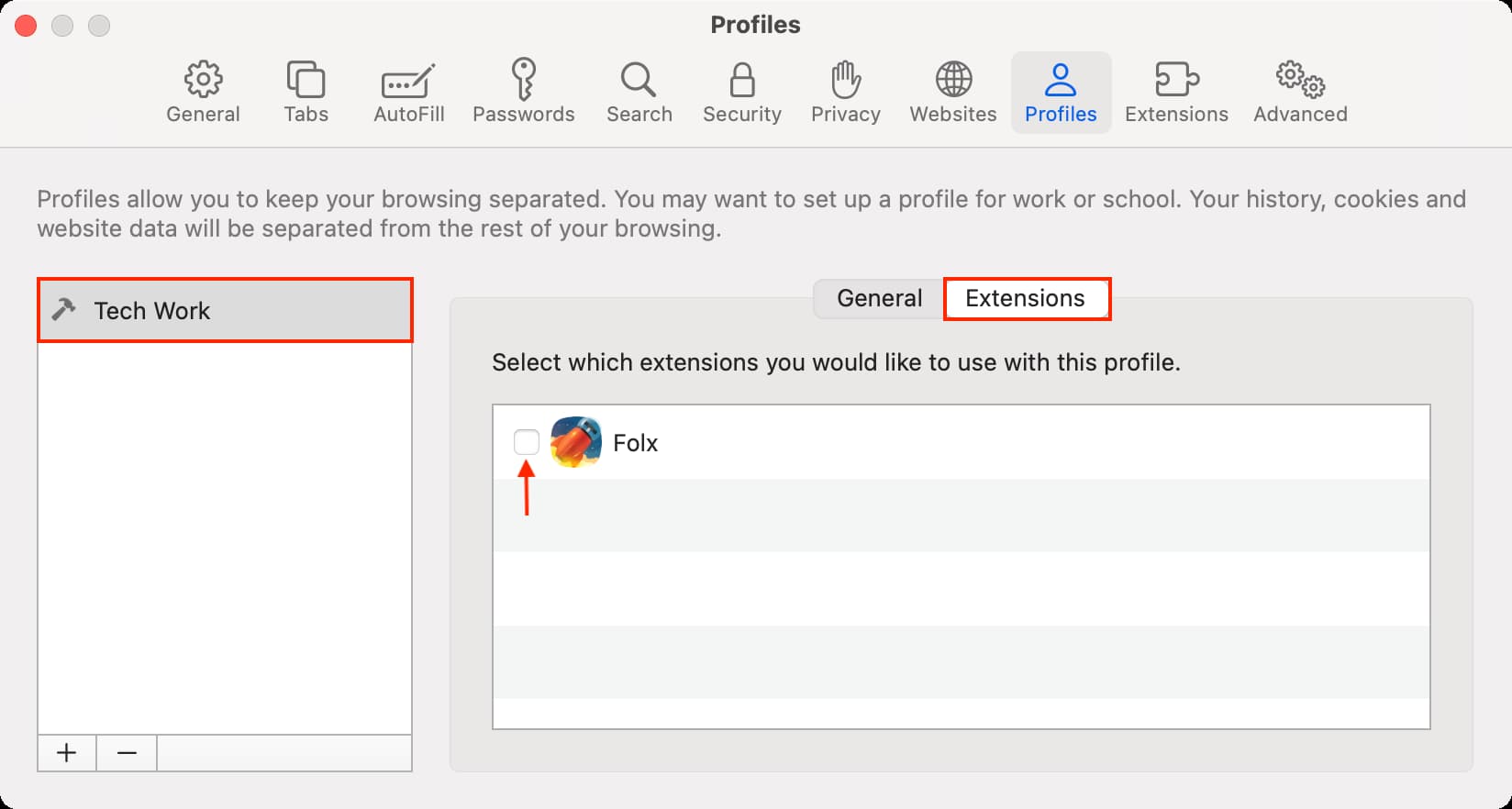 Bovendien kunt u naar Safari-instellingen > Profielen gaan > dit profiel selecteren > Extensies en ervoor kiezen om extensies die u in Safari hebt geïnstalleerd in of uit te schakelen.