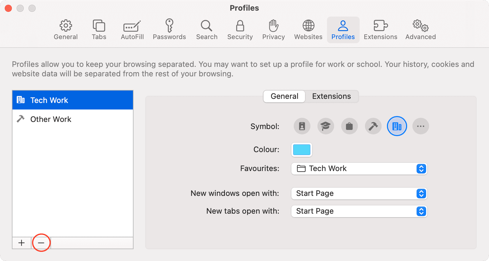 4) Om een profiel te verwijderen, selecteert u het, klik op de minknop en klik op Profiel verwijderen.