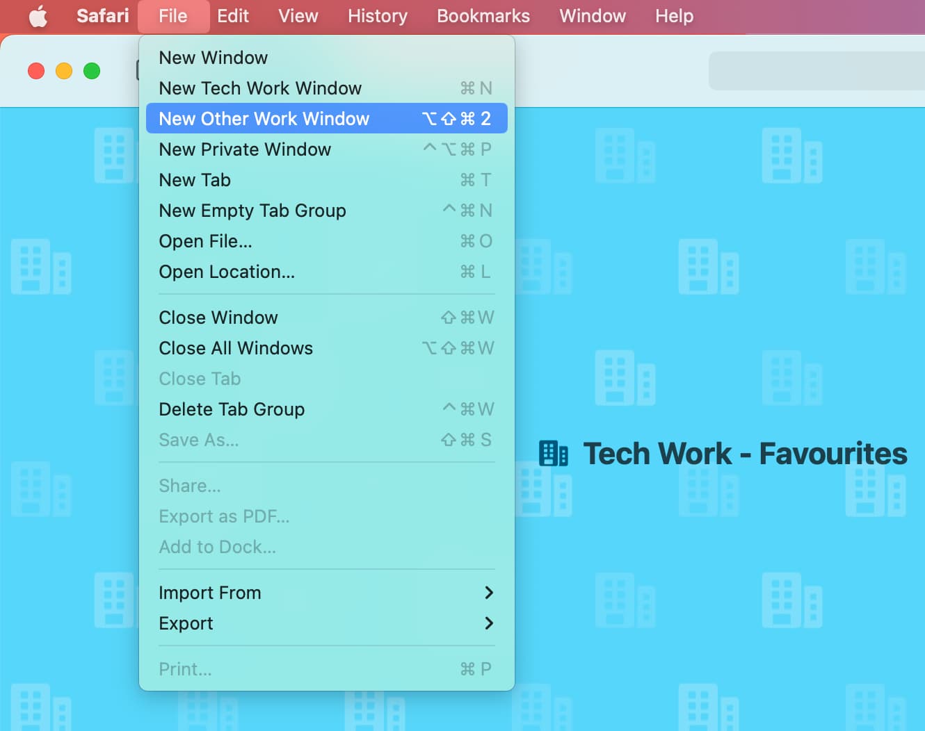 Klik op Bestand in de bovenste menubalk en kies Nieuw profielnaamvenster. Als je meer dan één profiel hebt, verschijnen ze hier allemaal. Ik heb bijvoorbeeld twee profielen toegevoegd in Safari, en dus zie je New Tech Work Window en New Other Work Window. Als u Nieuw venster selecteert, wordt een venster zonder profiel geopend.