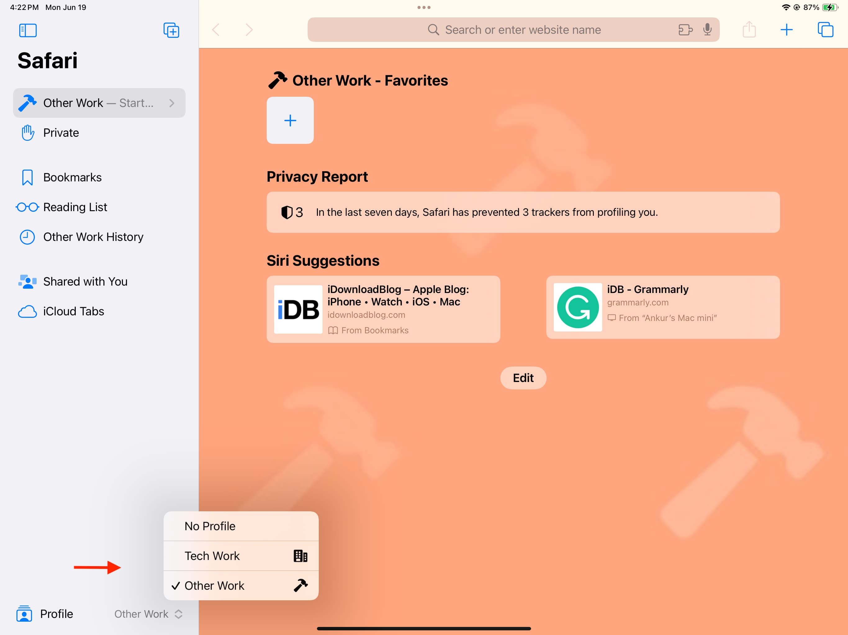 U ziet de optie Profiel alleen in Safari nadat u ten minste één profiel hebt gemaakt met behulp van de bovenstaande stappen. Als je dat eenmaal hebt gedaan, kun je het als volgt gebruiken.