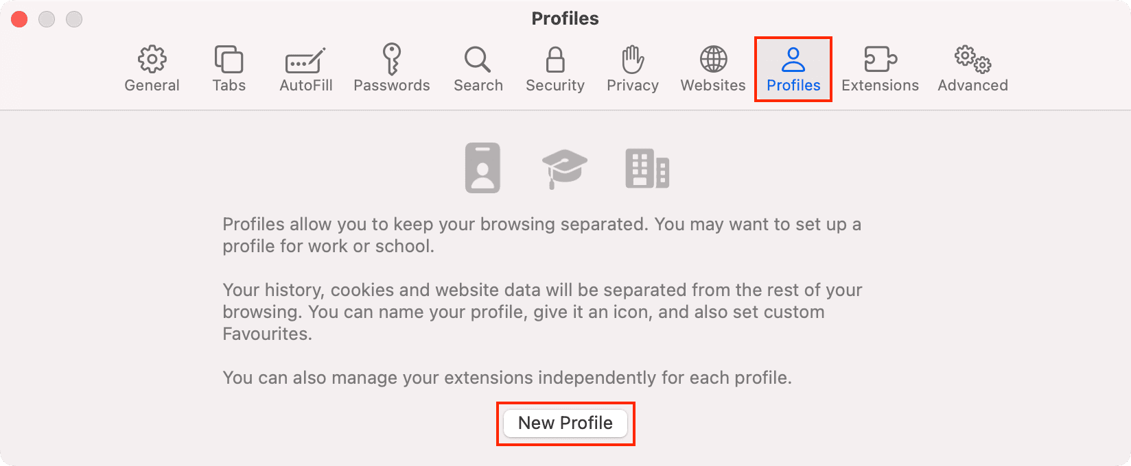 Safari opent een nieuw venster voor dit profiel. Uw zoekgeschiedenis van dit profiel, cookies, tabbladgroepen en favorieten blijven gescheiden van uw Safari-hoofdprofiel.