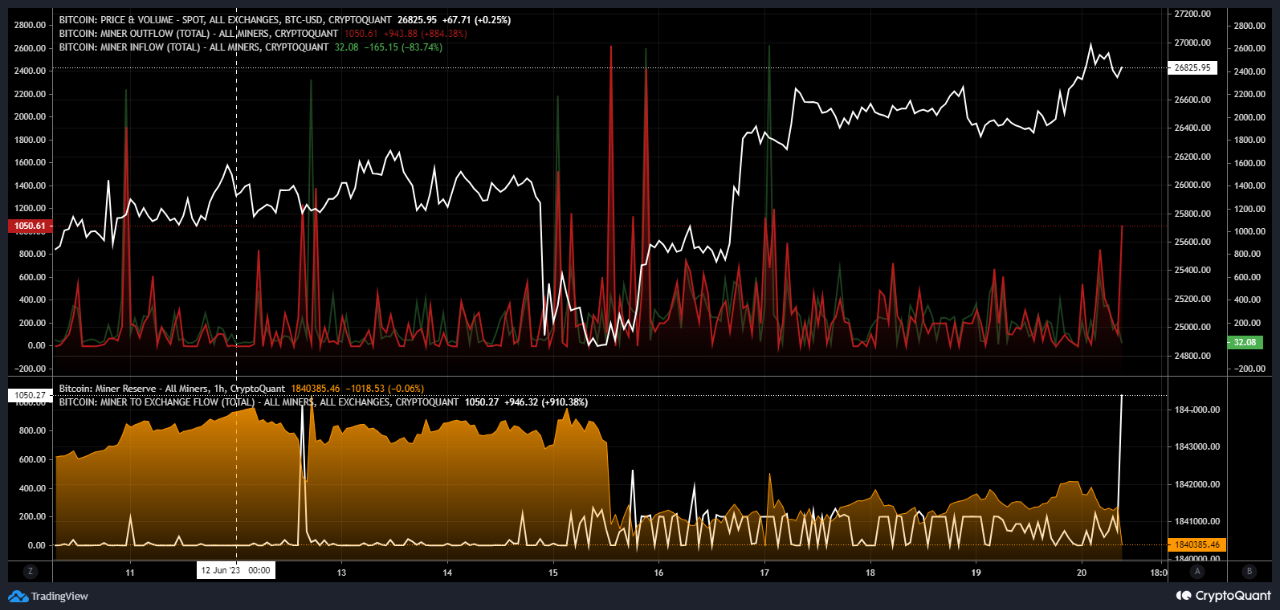 Een analist in een CryptoQuant post wees erop dat BTC-mijnwerkers munten uit hun portefeuilles onlangs. De relevante indicator hier is de”miner outflow”, die het totale aantal Bitcoin-miners meet dat zich terugtrekt uit hun gecombineerde voorraad.