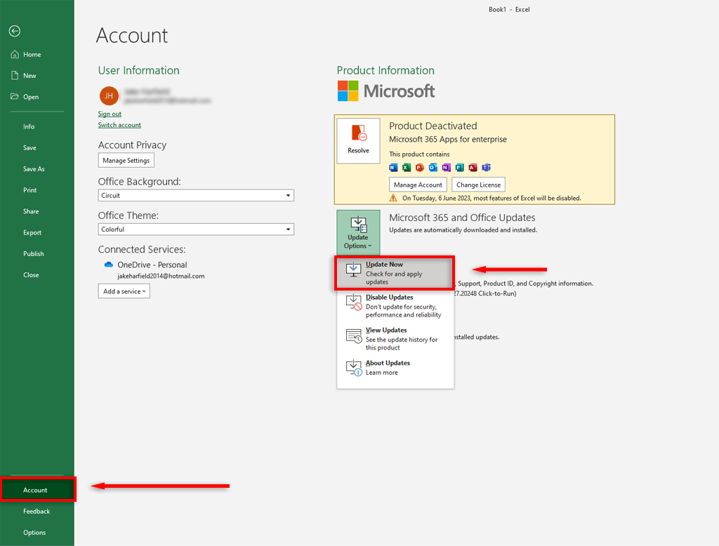 Software-updates lossen vaak tijdelijke problemen op. Om ervoor te zorgen dat deze storing niet wordt veroorzaakt door een verouderd Excel-programma, moet u het bijwerken naar de nieuwste versie. Om dit te doen: