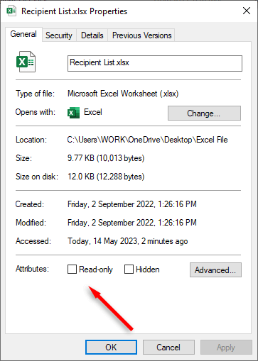 MS Excel kan moeite hebben om bestanden te openen die zijn ingesteld op”Alleen-lezen”. Om dit op te lossen, moet u ervoor zorgen dat uw gekoppelde bestanden de juiste schrijfrechten hebben. Klik met de rechtermuisknop op het bestand en selecteer Eigenschappen. Zorg ervoor dat naast’Kenmerken’de optie Alleen-lezen is uitgeschakeld.