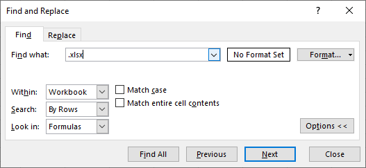 Open de Excel-applicatie. Druk op Ctrl + F om de werkmap te doorzoeken. Selecteer opties. Typ”.xlsx”en druk op Zoeken naar. Selecteer onder”Binnen”Werkmap en selecteer onder”Zoeken in”Formules. Selecteer Alles zoeken.