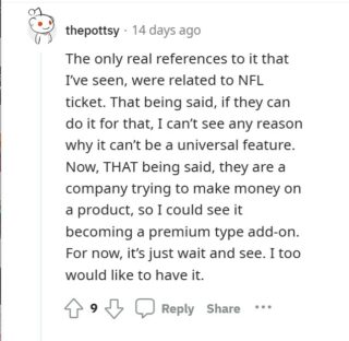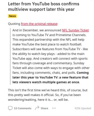 Sommige YouTube TV-gebruikers (1,2,3,4,5,6,7,8, 9) speculeren dat de multiview-of gesplitste schermfunctie mogelijk beperkt is naar Sunday Ticket-spellen.