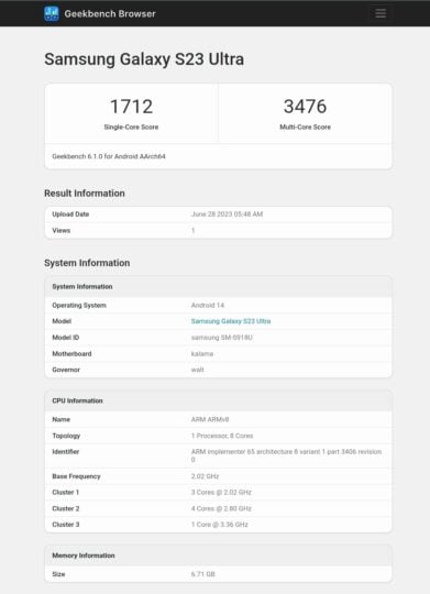 De carrier-locked versie van de Galaxy S23 Ultra bedoeld voor de Amerikaanse markt (SM-S918U) werd gespot in de database van Geekbench (via Tarun Vats). De telefoon draaide op Android 14 gebaseerde One UI 6-software. Het scoorde 1.712 punten in de single-core test en 3.476 punten in de multi-core test. Sinds er een echte telefoon is gespot met Android 14, worden interne tests nu op grotere schaal uitgevoerd.