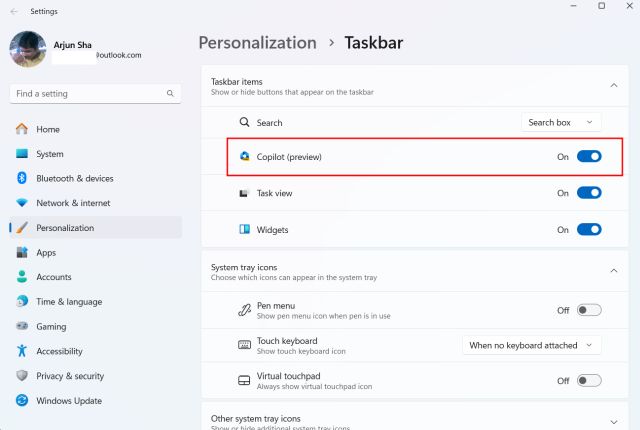 8. Als het pictogram nog steeds ontbreekt of als er niets aan wordt gedaan, opent u de taakbalkinstellingen en zet u de Copilot-schakelaar uit/aan.