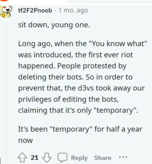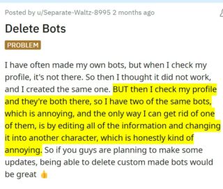 Gebruikers hebben gevraagd om deze optie om tekens te verwijderen die ze niet langer nodig hebben of willen delen met anderen. Ze vragen er ook om omdat ze geïrriteerd raken door de lijst met slechte of nutteloze bots in hun personagelijst.