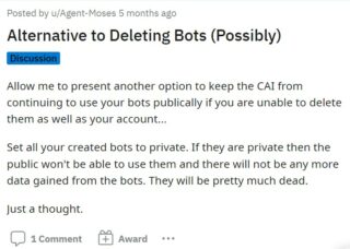 Meerdere Character.AI-gebruikers (1,2,3,4,5,6, 7,8,9,10) hebben de wens geuit om personages of bots op het platform te verwijderen.