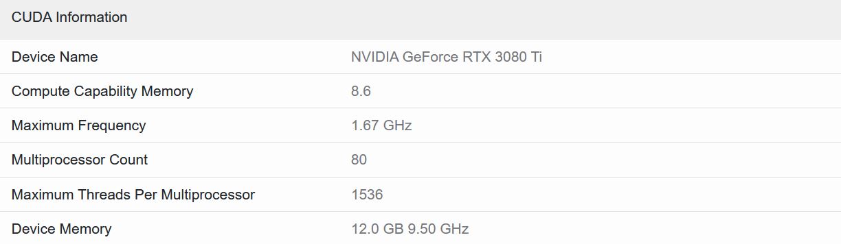 Karta ma 12 GB pamięci GDDR6X taktowanej z częstotliwością 9,5 GHz (19 Gb/s) i połączona z magistralą o szerokości 384 bitów zapewniłaby temu potężnemu silnikowi graficznemu przepustowość 912 GB/s. Patrzysz również na najlepsze możliwe testy porównawcze dla tego GPU z całkowicie wyeliminowanym wąskim gardłem procesora, ponieważ procesor używany do testowania karty to Intel Core i7 11900K, który może zwiększyć częstotliwość do 5,3 GHz. Testy porównawcze Geekbench CUDA podano poniżej: